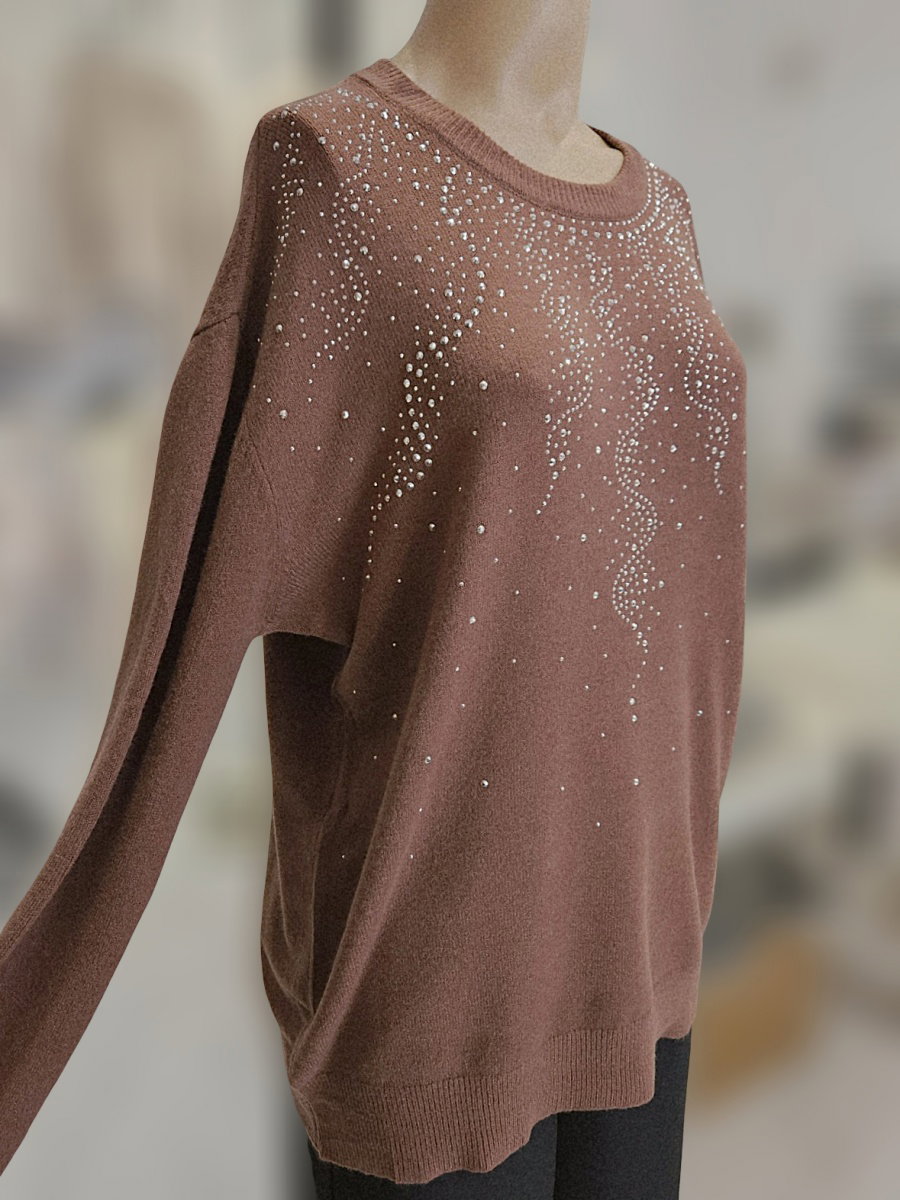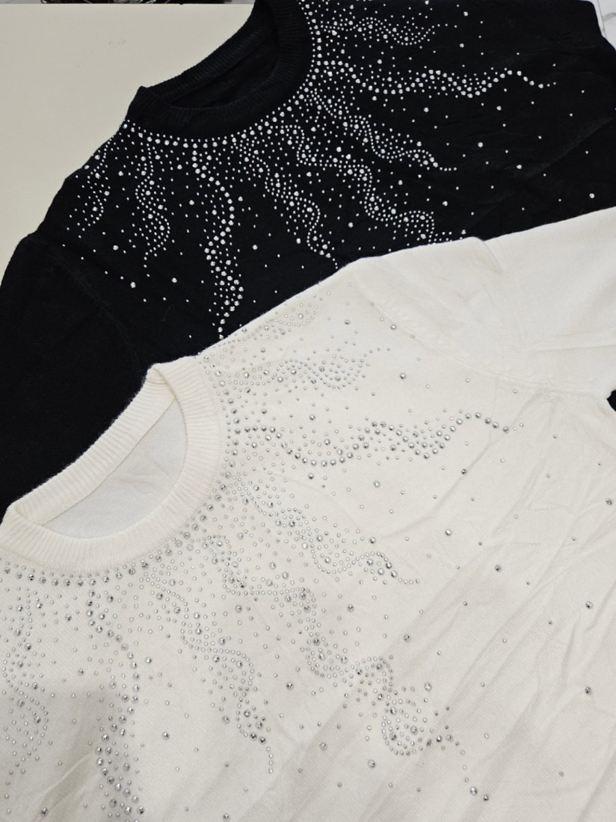 Sweater de tejido liso con aplicación de tachas formando ondas en el frente.