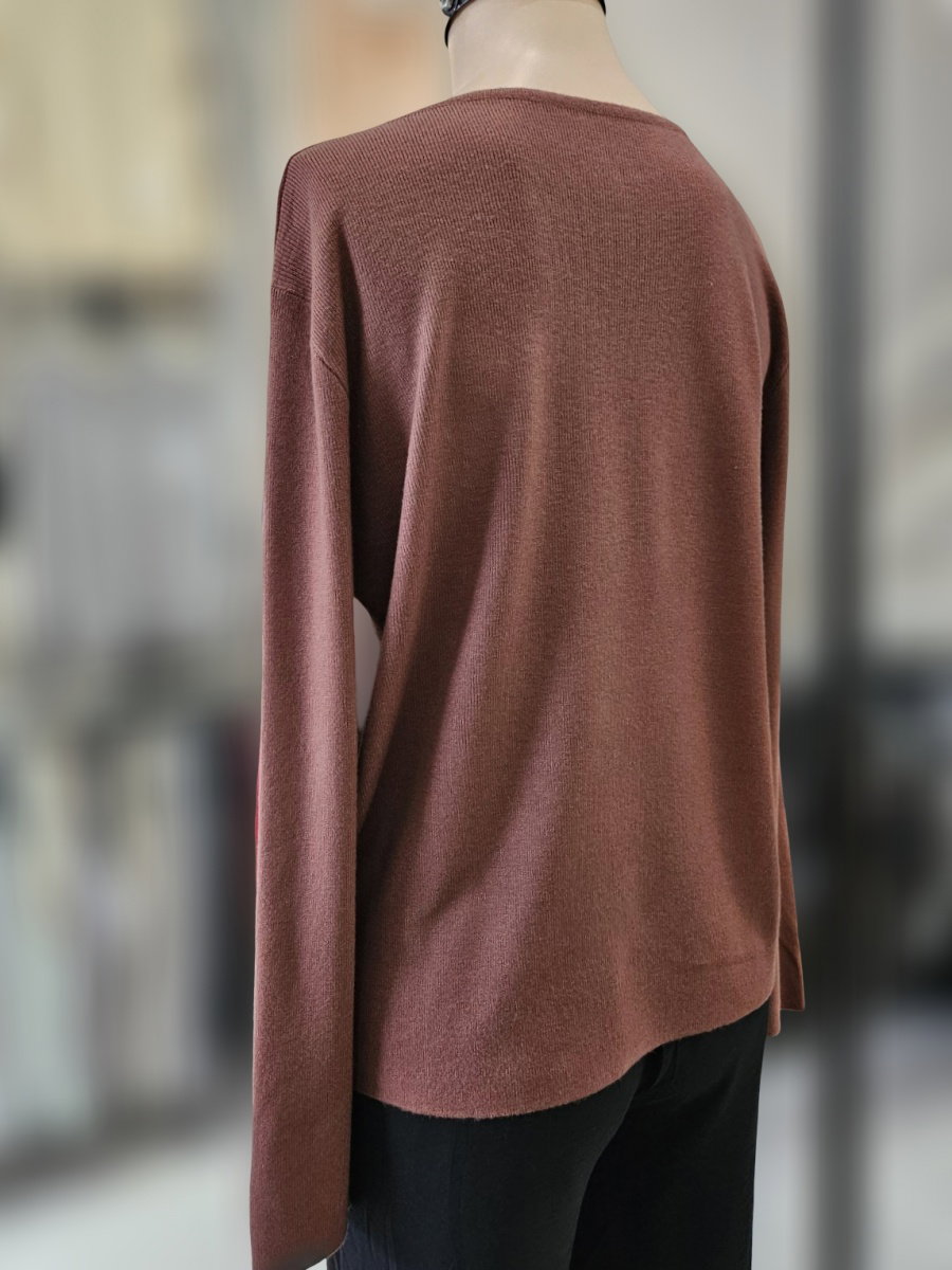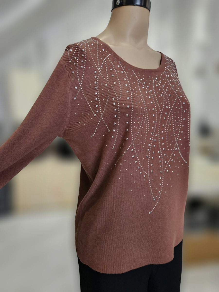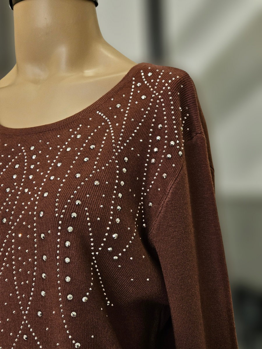 Sweater de tejido fino con escote amplio en forma de U. Presenta aplicación de tachas en el delantero superior, dispuestas en líneas curvas y descendentes. Calce recto levemente amplio. Mangas largas de línea simple. Terminaciones en cuello, puños y ruedo en tejido continuo.