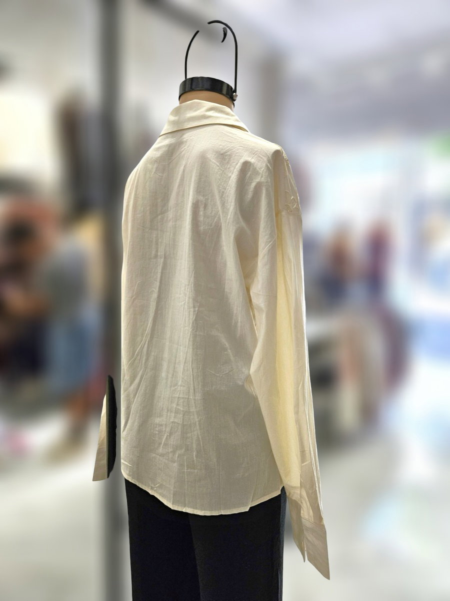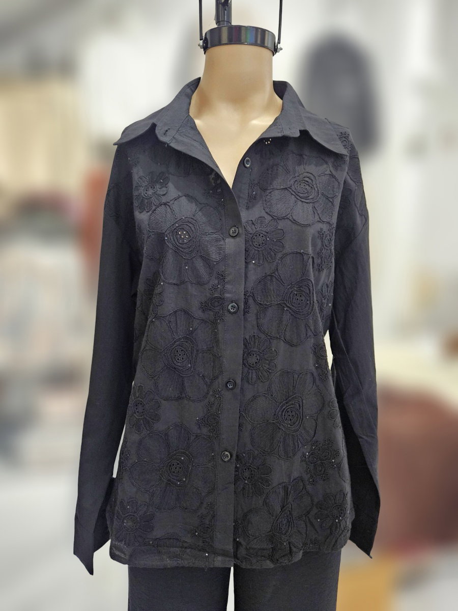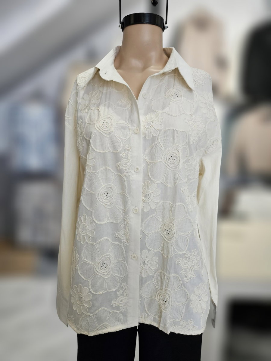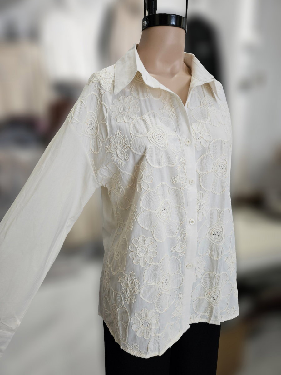 Camisa de tela plana con cuello clásico y apertura frontal con botones. Presenta mangas largas con puños rectos y calce levemente holgado. El delantero incorpora bordado floral en relieve distribuido en toda la superficie.