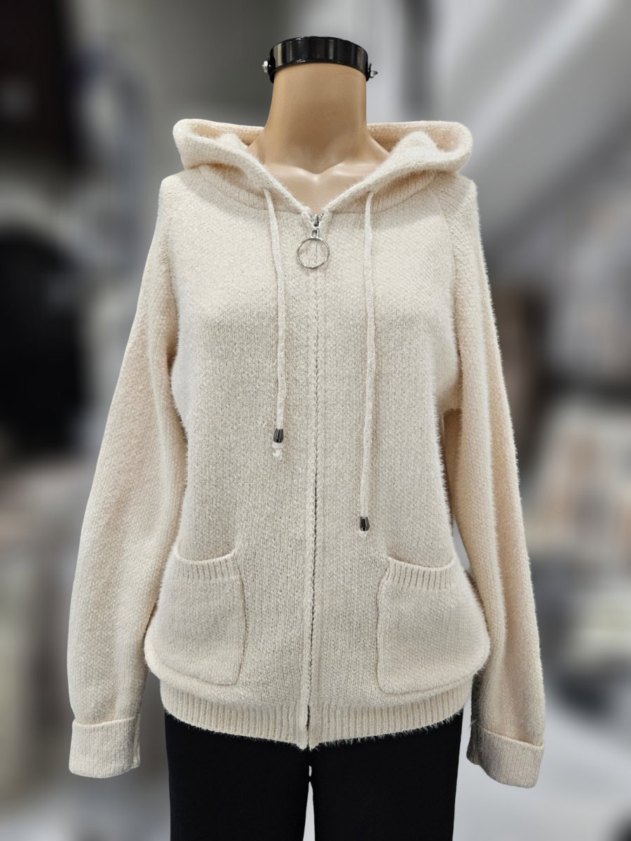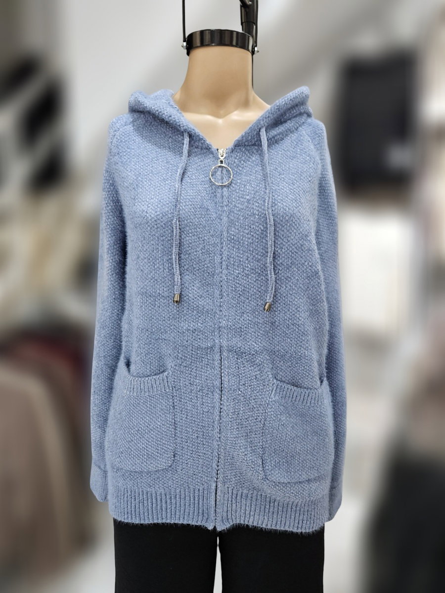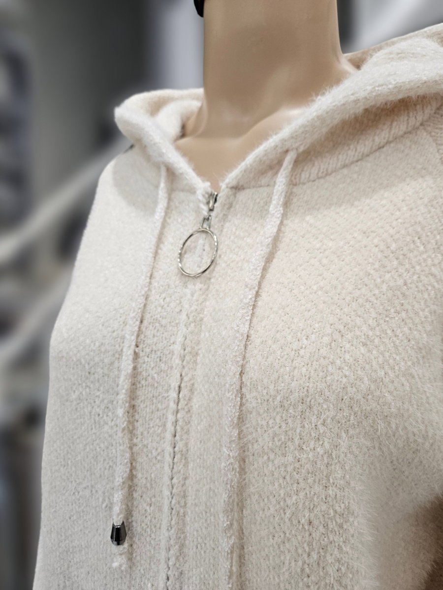 Saco tejido de punto con superficie lisa y textura suave. Presenta capucha con cordones ajustables y cierre frontal mediante cremallera con tirador metálico. Diseño de mangas largas con caída recta. Incluye bolsillos delanteros de forma cuadrada aplicados. Terminaciones acanaladas en puños y borde inferior. Calce recto con silueta levemente amplia.