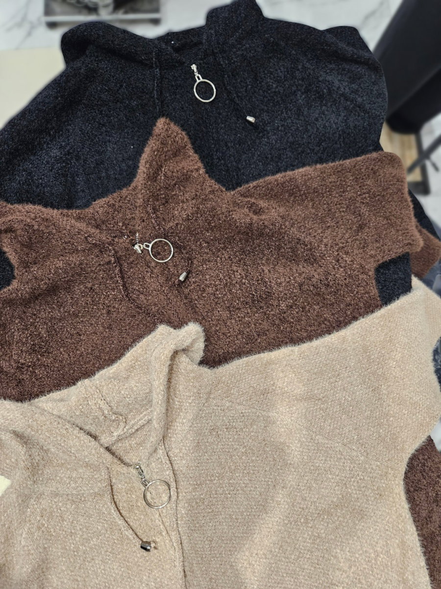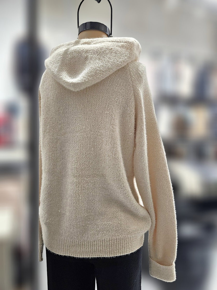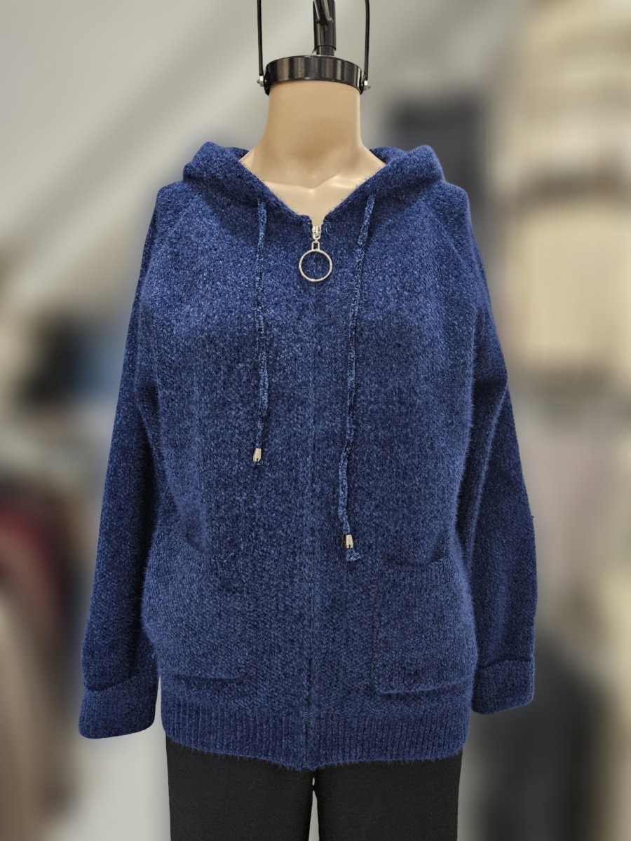 Saco tejido de punto con superficie lisa y textura suave. Presenta capucha con cordones ajustables y cierre frontal mediante cremallera con tirador metálico. Diseño de mangas largas con caída recta. Incluye bolsillos delanteros de forma cuadrada aplicados. Terminaciones acanaladas en puños y borde inferior. Calce recto con silueta levemente amplia.