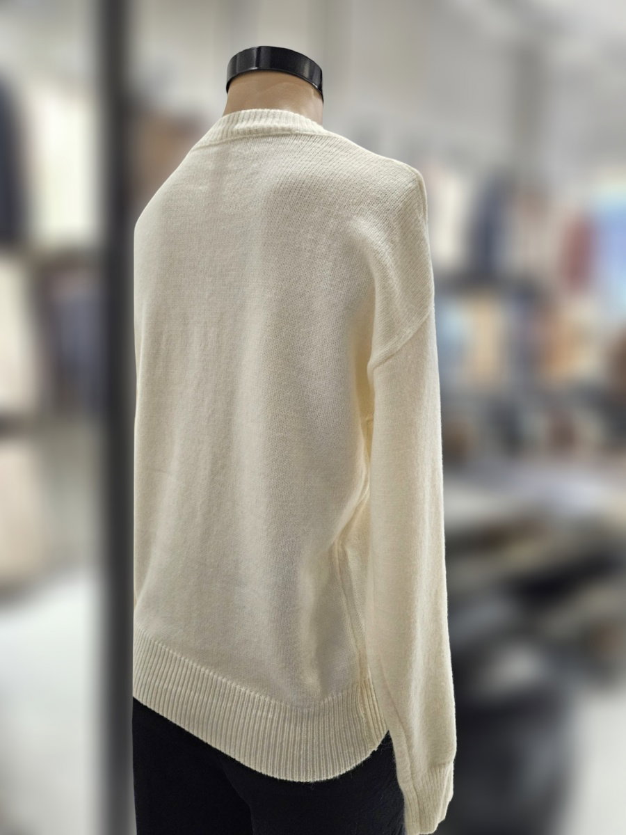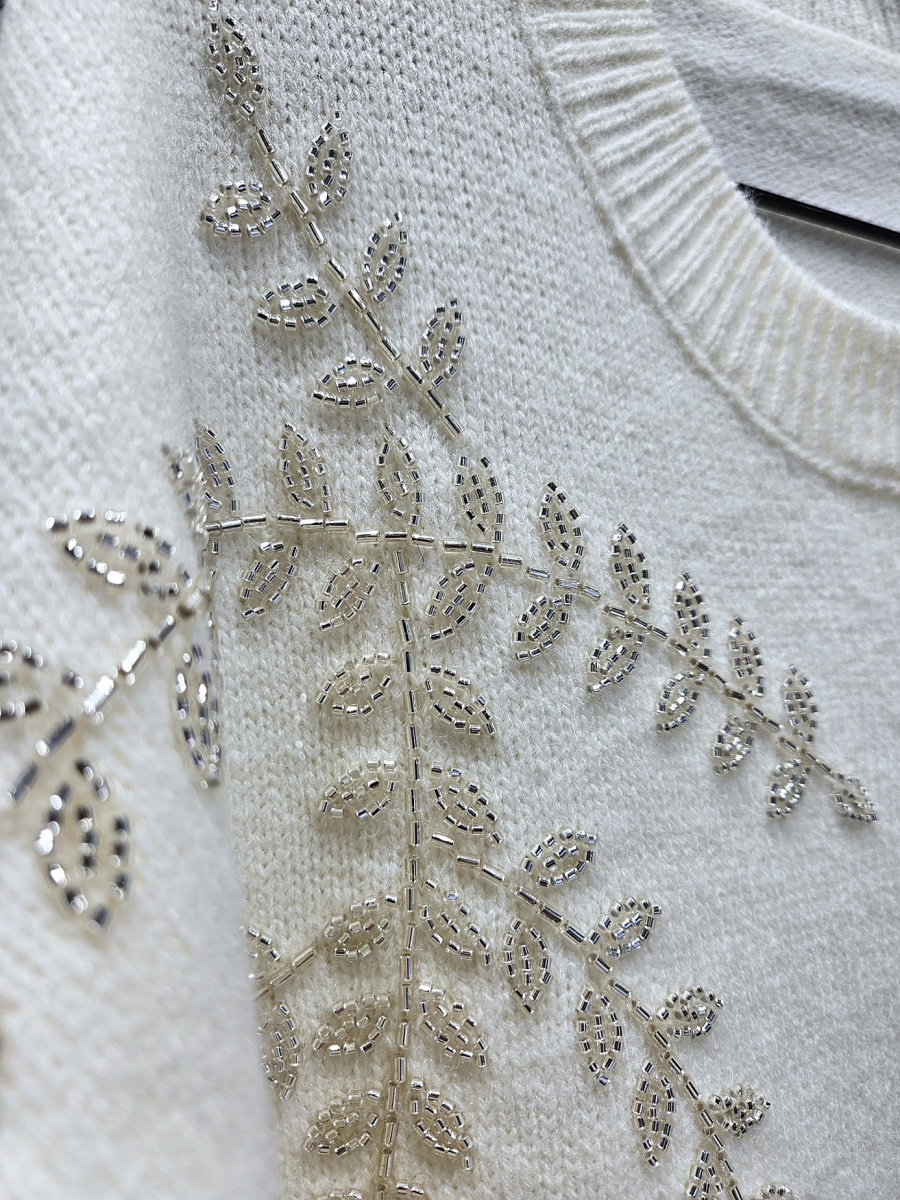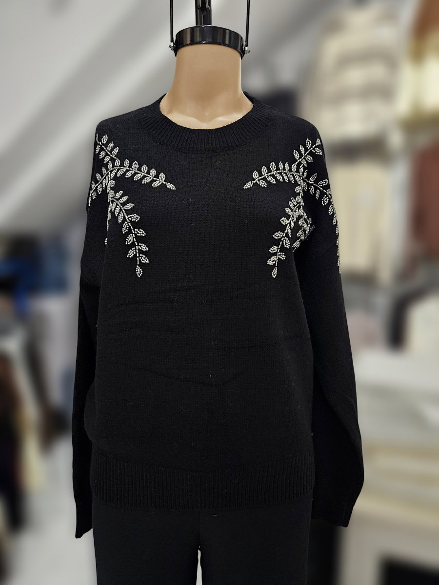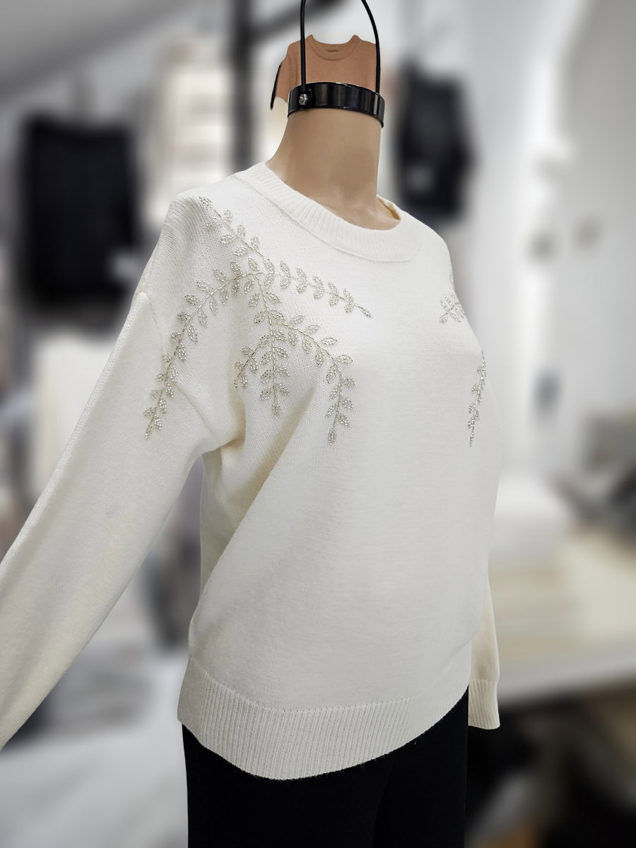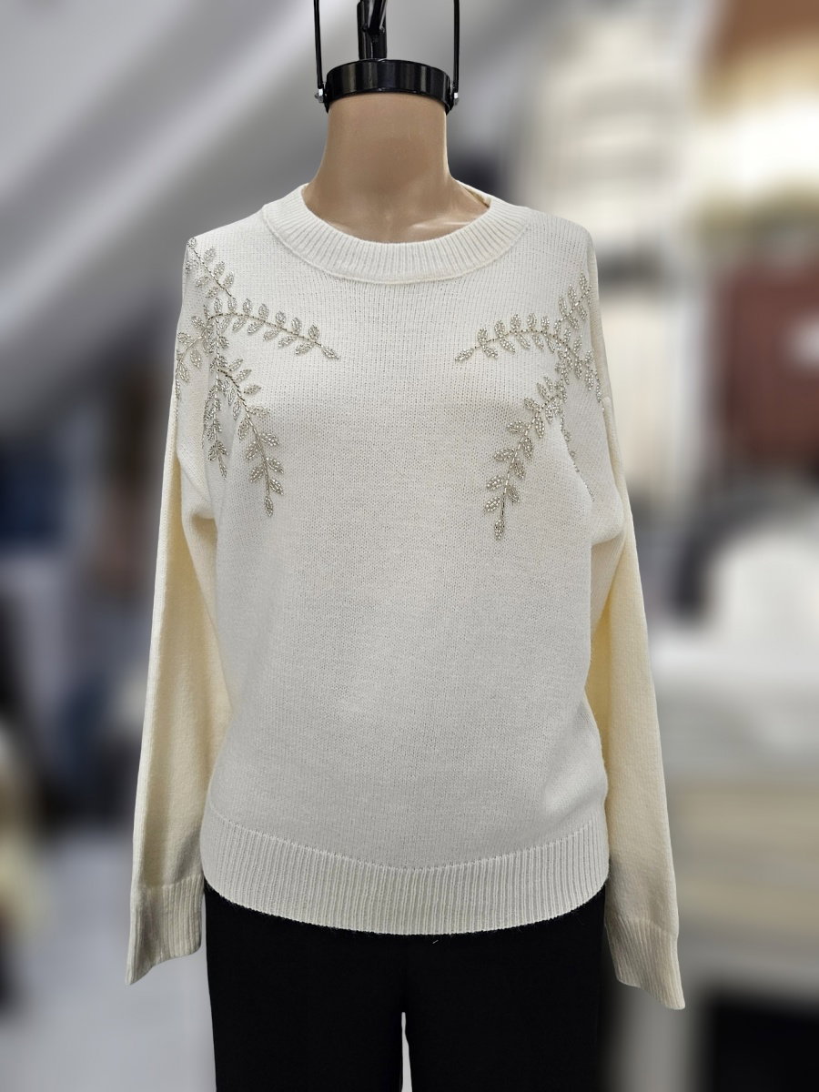 Sweater de tejido de punto con escote redondo y calce recto. Presenta mangas largas con terminaciones en rib en cuello, puños y ruedo. El delantero incorpora aplicación de mostacillas formando motivos de hojas en la zona superior, extendidos desde los hombros hacia el pecho.