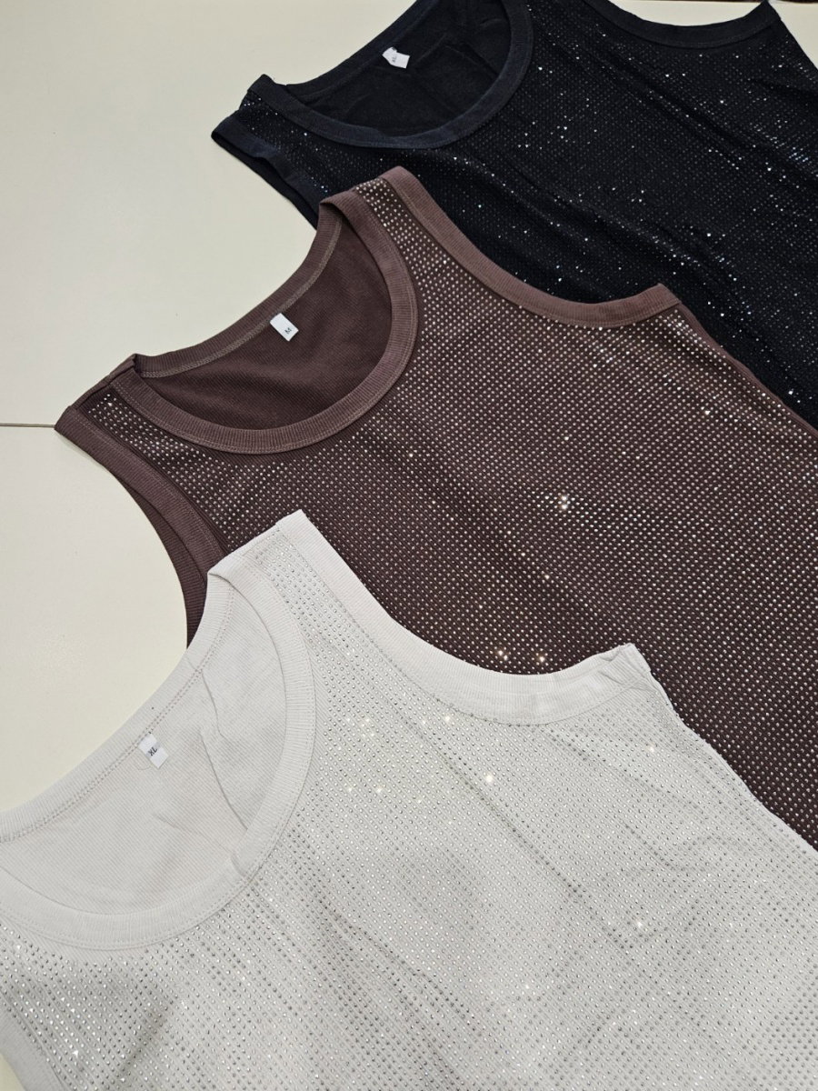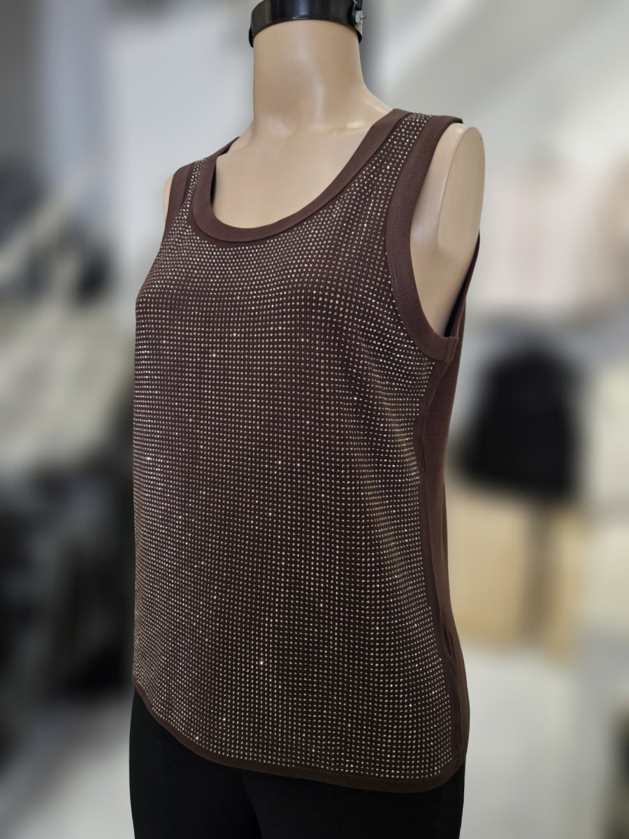 Musculosa de punto con silueta recta y largo a la cadera. Presenta escote redondo y sisas amplias con terminaciones en rib. El frente y la espalda incorporan aplicación uniforme de strass en toda la superficie.